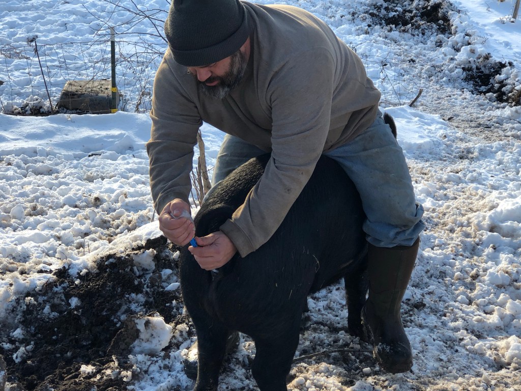 We made the calculations, and based on available butcher dates in the fall, we figured that we would need to inseminate mid-November. Pig gestation is 3 months, 3 weeks and 3 days, putting their due date as March 8th. The insemination process is ideally done in at least 3 doses and then the waiting begins. A pig’s heat cycle is about every 21 days, and it’s a long 21 days to wait! So the first 21 days went by with no heat, then the next 21, so we were confident that both moms were expecting.