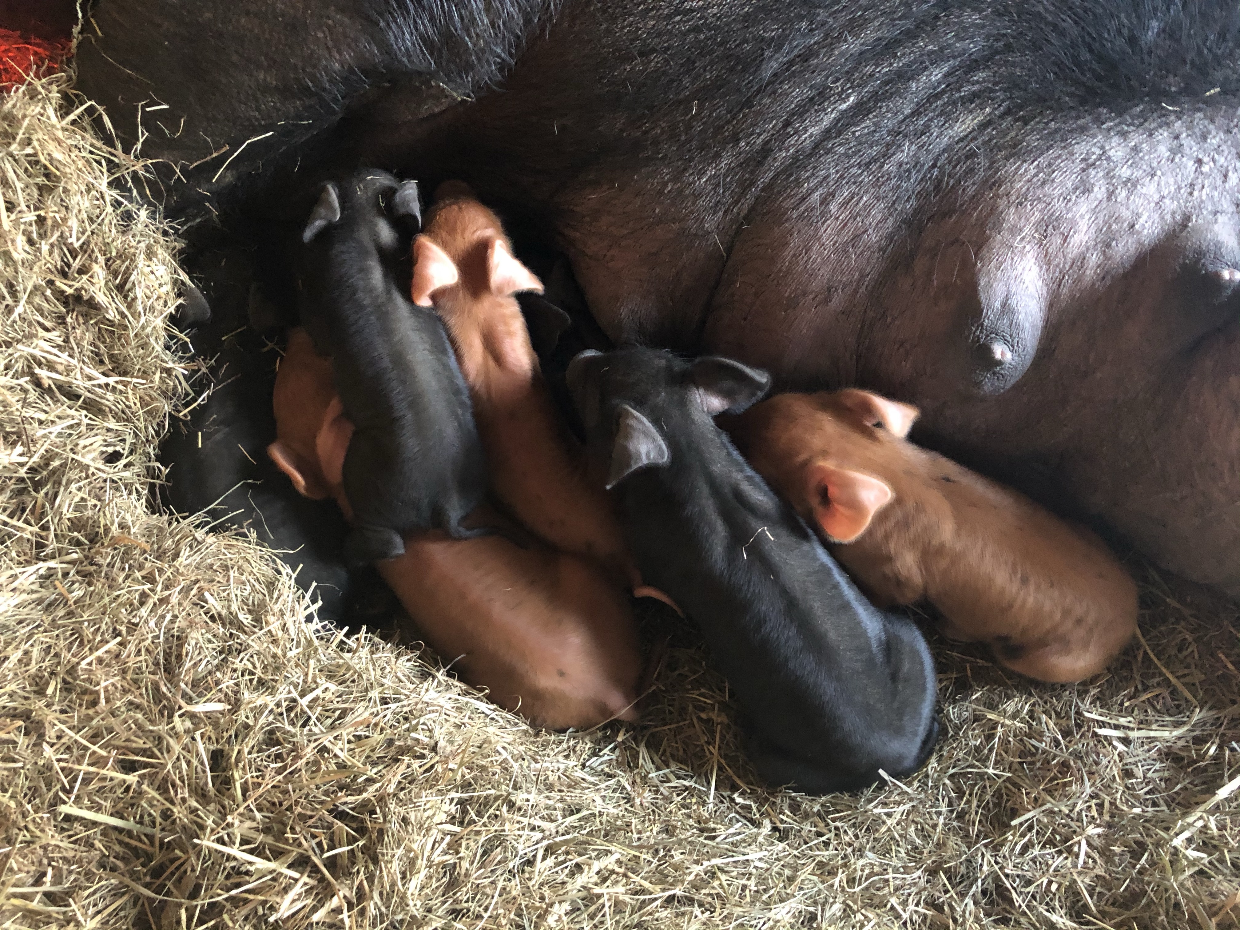 We live in the Northeast and March is a funny month. We can have spring-like temperatures and we can also still have many days of winter temperatures, and the late afternoon/evening of March 8th was no exception. At some point in the birthing process Sox got herself turned around and was basically giving birth out the side door of her house into the cold. Ok, so here is where the panic sets in. My better half, the brains of this crazy operation, was out pruning our grapevines when I realized that we were going to have to intervene if these little ones had any chance of survival. So I called him over in a quiet and calm voice (remember there is a mom giving birth at this very moment) to show him what was going on. We quickly grabbed towels and as she birthed, which was about every 10-15 minutes, I was picking up the babies, drying them quickly then handing them over to him to try to get them to nurse.  Please keep in mind that I am the one in the family who hates getting dirty, I can’t stand getting dirt on my hands or under my nails, but this was one of those moments that life throws you when nothing else matters. It’s just emergency “go mode”. We were so “in the moment” that we did not even know how many piglets were born. Once we were sure that the birthing was done, our count revealed that there were 10. One of the babies was struggling a bit to breathe and we assisted by suctioning out its mouth and nose, but we both knew that the chances of this little one’s survival was slim.